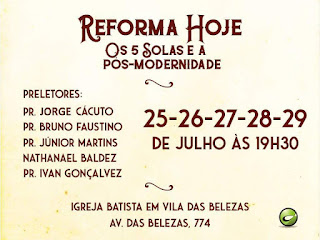 Na semana de 25 a 29 de julho aconteceu o evento REFORMA HOJE, no qual levantamos os temas da 5 Solas e as perspectivas dos desafios de hoje. Aqui é um resumo de cada tema principal na semana. Foi exposto no culto matutino de 30 de julho na IBVB.